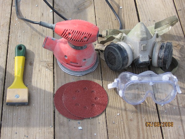 Tools: Paint scraper, orbital sander, safety goggles, respirator and pressure washer