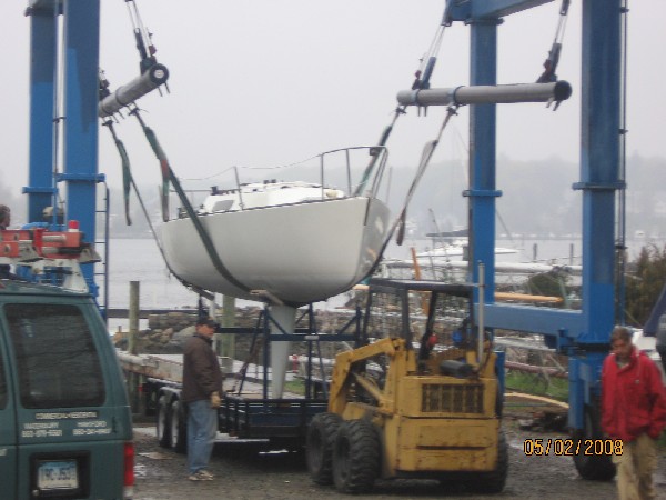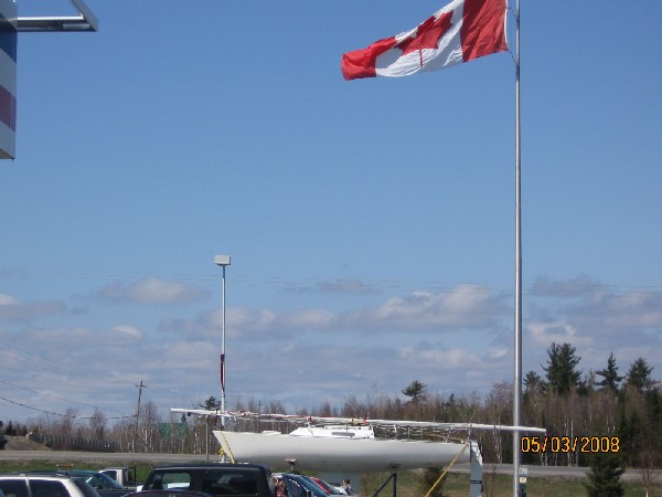On the first of May the cradle was loaded on to the trailer and we set off on our journey thru a freak May snowfall. We arrived at the marina at 7AM the next morning after driving all night. This afforded us an hour to inspect the boat with no seller or marina staff on hand. This accomplished we set off for breakfast to await the yard to open for business.