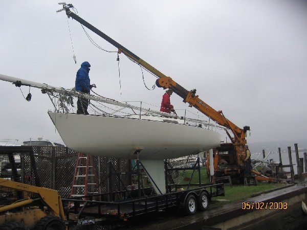 By 12 noon we had the boat loaded on the trailer, had met the seller and had all the sails, cushions, motor etc... loaded. Another two hours had the mast , boat and cradle secured and we were ready to leave the marina for the last time. The previous owner had provided me with all the papers tracing ownership of the vessel back to original factory purchase as well as invoices for work that had been done.
