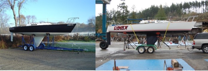 Below J27 Cuckoo Voodoo on a P5000 trailer by Marine Cradle Shop and J27 Remedy on modified Etchells trailer.