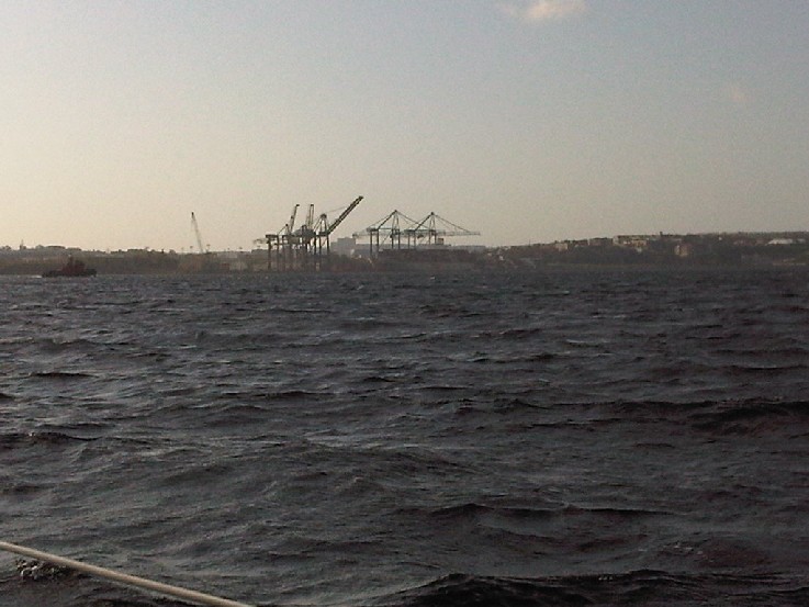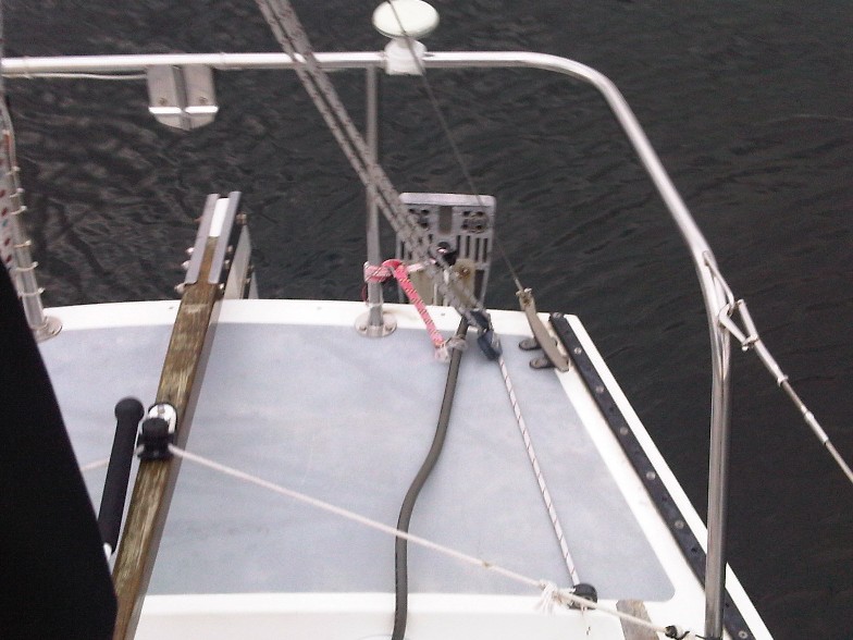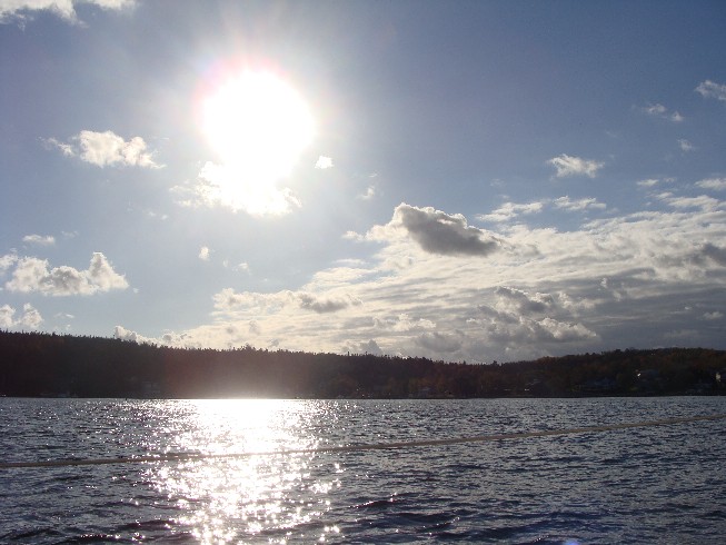 Windy. Still warm but windy. Forecast was for 22 knots gusting to 30 and ended up 32 steady gusting 38 at one point. On board we had Erwin and Dianne with whom we raced the Silver Sail, Sheelagh, Heather, Mike. We opted for the #3 and reefed main with max backstay etc... Prior to start one boat dropped out because was too windy and the boat could not handle it. Also prior to start two other boats tore their mains and retired. This left only 5 boats to actually start the race. A varied fleet with a Tartan Thomas 35, J/29 Fr, J/27, J/24 and a Bluenose sloop. All boats but the J/29 had reefed mains - on some double reefed. We had a short upwind leg followed by a reach and then a longer upwind leg. During this point in the race the windex blew off - again! That is now the 4th windex - three have blown off and one damaged by a crane. Approx 2/3 thru the long upwind leg we had max everything and reefed main flogging. Rail and stanchions still buried with just the blade pulling. Was at that point we decided to abandon the race and relax. Small tear in luff tape on jib was only damage and with the warm weather was very enjoyable.