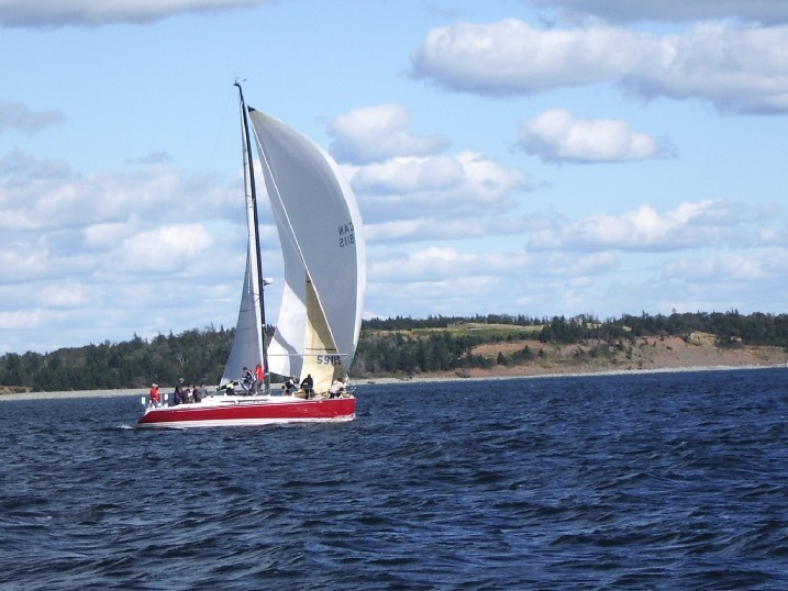 With Nut Case now launched in its home port of Barrachois Nova Scotia we had our first club sailing event of the year - The Summer Solstice race. Is a pursuit race format and a great way to initiate new members to racing with the uncluttered start lines. Our cold and wet Spring had resulted in late launches so we only had six boats for this race. The conditions were 20+ so we picked a short reachy style course and had all entrants agree to running a reefed main. On board were Heather, Mike, New father Jamie from Torch and Kim from Prospector. This was our first opportunity to try our new #3 and we immediately fell in love with it. The shape built into the sail is great and really gives a lot of power thru waves. Nut Case being the only race boat in the fleet out pointed the other boats by at least 20 degrees and easily sailed to a first place finish. The boat felt really good and we all had a great time. results