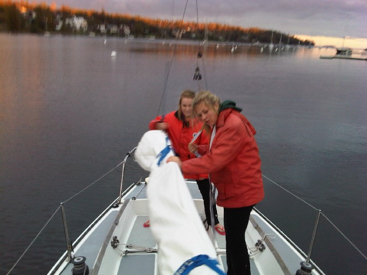 Sarah and Ceilidh rolling the sail
