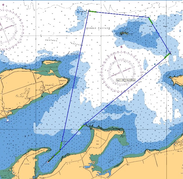 As we were preparing for the start there was a bang and the boom end of the rigid vang separated from the boom. We were now four minutes to start time and in sequence. Woody asked Heather for a short length of line and set about rigging something to hold the boom down. Meanwhile Mike was sailing the boat to the pre start area Woody suggested and tacking repeatedly in the cramped area while Karen and James were hoisting and then trimming the jib. With approx 30 seconds to the start the temporary vang solution was in place, the jib trimmed, the boat in good position and the crew ready to go. Nut Case ended up with the best start in the fleet and was second boat out of the Arm during the long tacking sequence. Not bad for a boat with a busted traveler and vang!