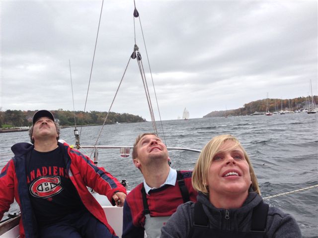 A tribute to the Montreal Canadiens! Mike, James, Karen sailing up NW Arm under spinnaker