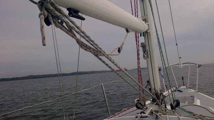 The race started right off the breakwater at the club house which meant sailing thru a mooring field and then in tight quarters for the start. In the NW Arm the wind was lighter than forecast so we went with full main and #1. We did a few tacks and gybes as we maneuvered for start and after one gybe the bearings fell out of main traveler. Then one more tack and we crossed the line to start the race .... with the traveler car a foot and a half above the track! Nabil came to the rescue with some spare line as we managed to lash traveler car centerline and then trim main and try to catch up to our fleet.