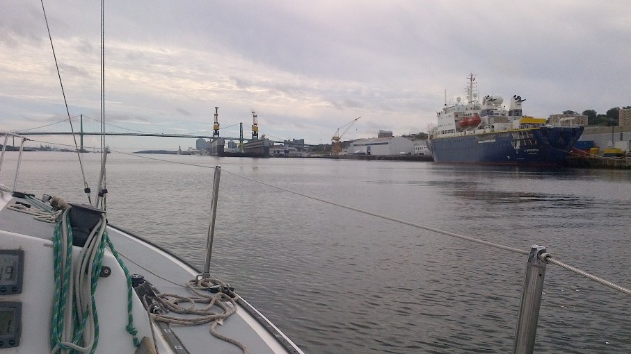 On board were Heather, Mike, Kevin from Koobalibra and Brian who sails on a Whitby 42 and also a J24. The forecast was 20 knots and 20mm rain. In the end was 10-20 knot forecast and light drizzle that turned to dense fog. Initially there was decent visibility but the fog soon closed in as the boats headed into busy Halifax Harbour. After the first hour of the race Nut Case was all alone in her own shrouded world. A world that was punctuated by fog horns ... loud booming fog horns, a VHF tuned to the Halifax Traffic channel 12, ships that we never did see, ferries, tour boats and somewhere other racing sailboats. As the race progressed during the long beat out to the outer harbour the wind fell from 15 knots to 10 to less. Eventually after a little over 2 hours Nut Case approached the windward mark - H14 in Halifax Harbour off McNabs Island. By this time the wind had almost disappeared. Then looming out of the fog was a sailboat - the 1D35 Climax who had just rounded the mark and was heading back. We were thrilled that we were that close to a boat rated PHRF 33 less than 1/10 mile from our windward mark! What we did not realize was that Climax had rounded the mark close to 20 minutes earlier and that we were still another 20 minutes to the mark ourselves. Shortly after that we saw two more boats loom out of the fog - a Viking 33 and a Kirby 30 racing from the Armdale Yacht club in a completely different race. Three sailboats in 10 minutes after seeing nothing for an hour! We rounded the mark and drifted - SLOWLY- back toward Wrights Cove. Traveling 0.25 knots over the ground. Ouch! Shortly after that another Kirby 30 - Five of Harts - from our race motored by. They could not get to the windward mark having tacked a dozen times or more so dropped out.