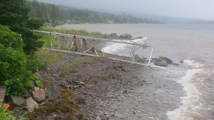 Saturday had been calling for snotty conditions and did not disappoint! Mike woke Saturday morning at dawn and the dock in front of the Boat House was gone! In our protected spot the wind was still 20 knots on shore after having diminished from a reported high of 74 knots over night in Baddeck. Shortly after this Bill, Patty and Zion came out to retrieve the remains of the dock and Mike helped wrestle it up on shore and to safety. By this time Kim had called to say that Prospector, Nut Case and Koobalibra were all safe and that the races were cancelled. With the diminishing wind we saw Stampede and two other boats sail downwind from Baddeck to their protected anchorages rather than stay rafted together on the bouncing docks at Baddeck.