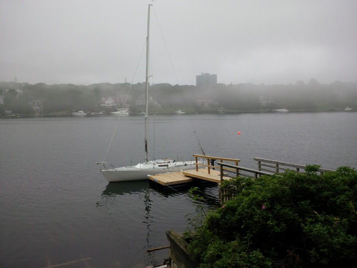 With the boat home there was a bit of scrubbing of the hull and then it was time to launch again. A post tropical storm was coming up the coast so we decided to wait til Saturday to launch. Nut Case was relaunched at Bedford Basin Yacht Club using the club crane Saturday morning and then motored back to the NW Arm in the early afternoon ... in the fog. Thanks to Marc for all his help yet again to launch boat and step the mast and thanks to BBYC for allowing use of their crane.