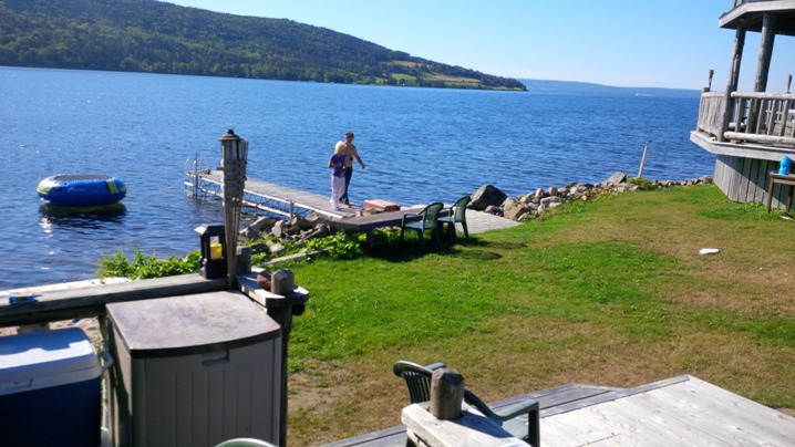 After two nights and three days on the boat we decided to stay in the Yellow Cello in downtown Baddeck. The room included use of a huge common room below and our friends Dave and Jennifer were in the room beside us. Dave is the skipper/owner of Koobalibra the C&C115 that heather and I race on. Also attached to the room is a huge private sun deck and laundry facilities. This was great and we were both pretty excited in a way you can only be after spending three days on a J/27. I walked out on the deck and heard someone calling for Mike. Since there was a 6 foot high privacy wall on one side and open to the lake on the other I had no idea who was calling or who they were calling until I heard the call again - but this time "Mike Hoyt". It turned out that thirty feet away on the other side of the privacy wall were our friends Kim and Andy Shand of the C&C 99 "Prospector" in the house they had rented for the week. Kim had seen the top two inches of my head and somehow recognized me!