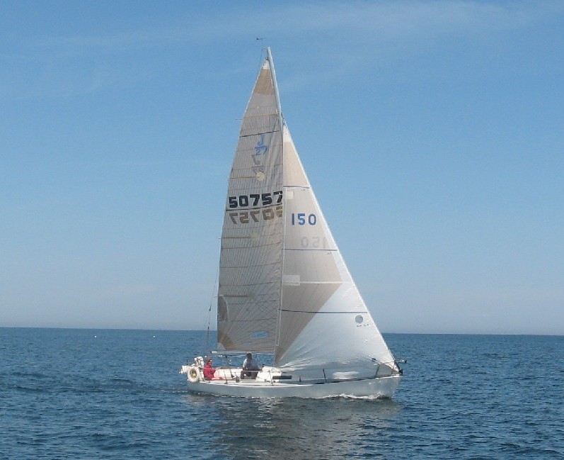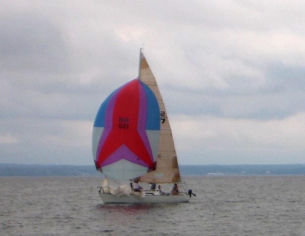 At the windward mark we launched the spinnaker with no problems. It looked like we would perform a gybe at the next mark and carry the chute two of the three legs of the triangle. The gybe was slow at the mark and then we immediately realized the wind was too far forward to carry the chute. Since we were still cleaning up from the gybe we were slow in dousing spinnaker and raising and trimming genoa. We lost the gains we had made with the chute up. Next upwind leg was uneventful as was the next launch. We picked the angles such that we could gybe early before the next mark and then head up at the mark - of course the wind again shifted ahead at the mark and there was no way we could carry the chute again - at the same mark as last time! We tried to douse in a hurry and there was a knot in the guy which resulted in yet another four or five scrambly minutes, a cut guy, a slow period of sail trim a wet chute and all downwind gains lost. Ugh! The wind had picked up so we changed to the #2 and headed back upwind again for the last time to be followed by a straight downwind to the finish. Of course we were late to pack the chute and had to run a new guy so in our hurry the sheet snap shackle let go on launch which resulted in yet another 4 -5 minutes of mad scrambling with a chute in the water sporting a seven foot tear. We retrieved the chute, trimmed the main and #2 then launched the other spinnaker (uneventfully this time) and completed the race. We calculated we needed 11 - 12 minutes on the Kirby 25 and ended up with only 7. Despite all this we finished second and had a lot of fun. Results can be found here.