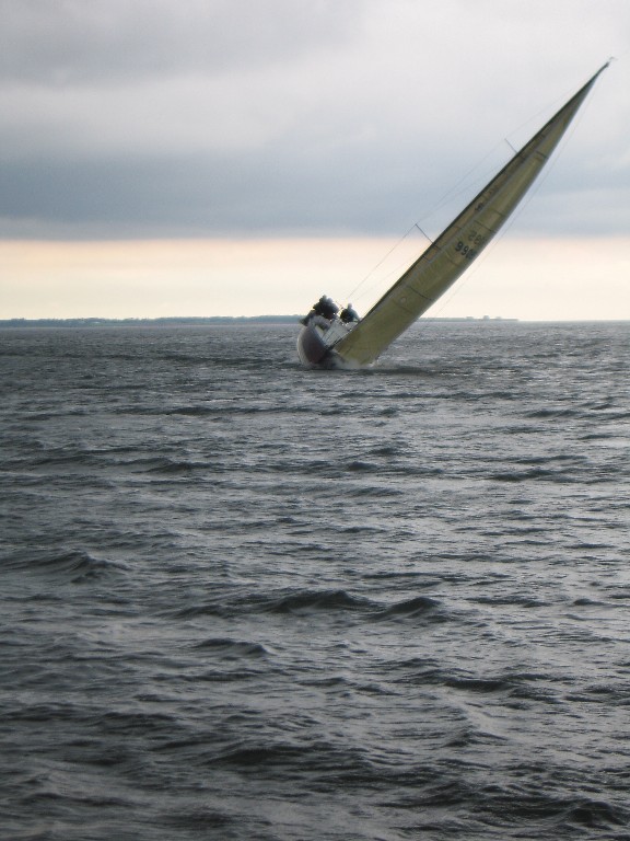 Our first race. Peter showed up on helm with his friend Larry P for crew. Larry B our foredeck guy arrived 2 hours before race. Crew rounded out by Heather and I on mast and main. That morning the halyards other than one genoa halyard were not yet sorted out, the uphaul/downhaul cam cleats not yet installed and the mast had not been tuned. Larry spent 1.5 hours sorting out foredeck, I lowered roller collar and Peter and I tuned the mast. Race time at 1PM sharp and we were still organizing the foredeck as we motored out to the start area. One minute before start we had barely made it to the right side of the line, were just hoisting the main and had not headsail on deck.